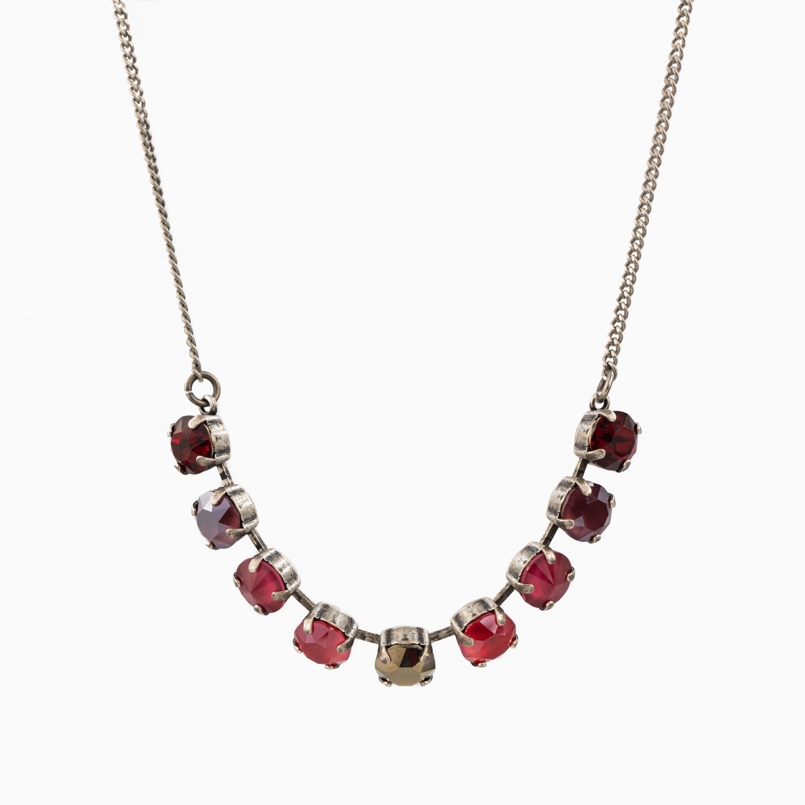 Colier cristale Austria multicolore rosii 8 mm montate in casete placate cu argint antichizat