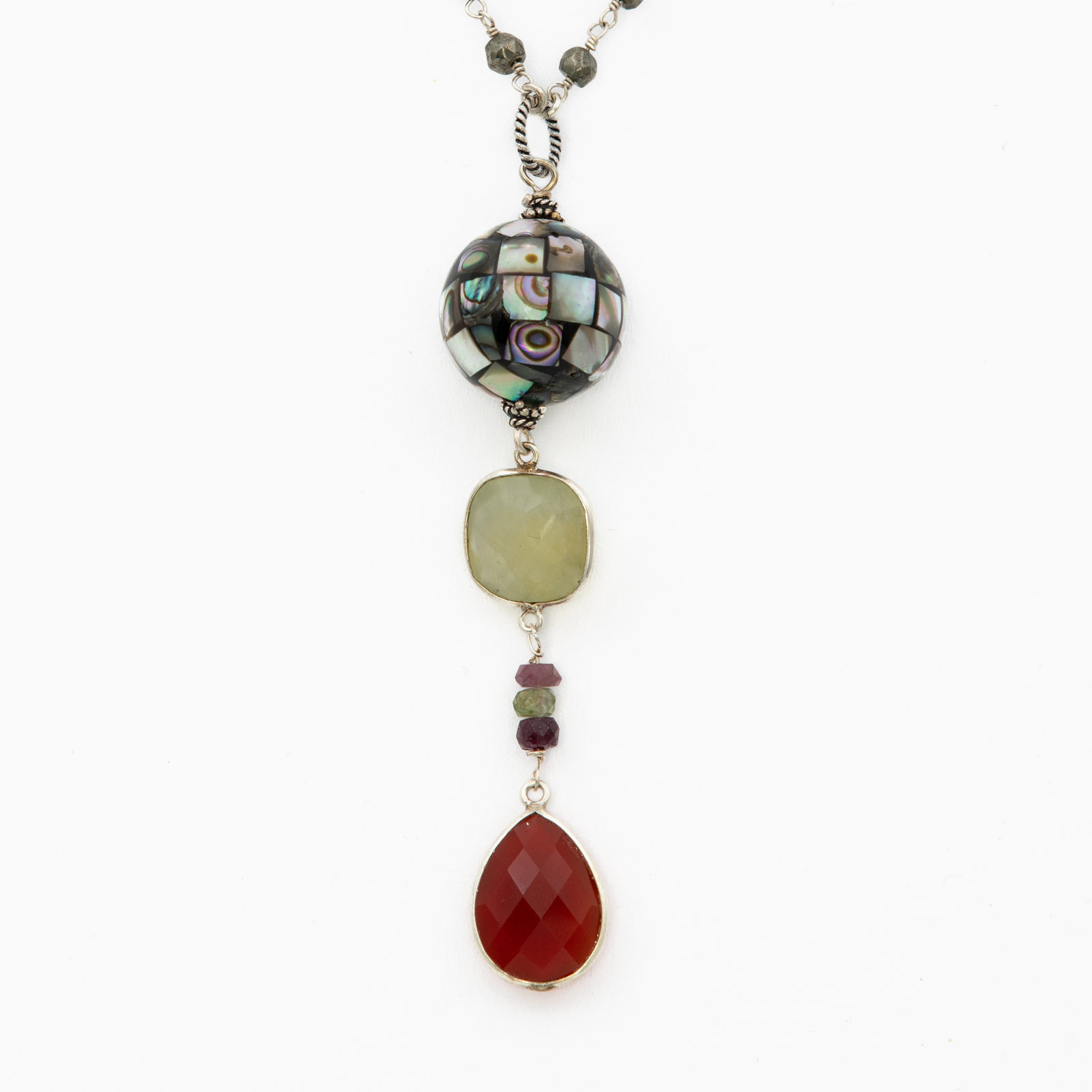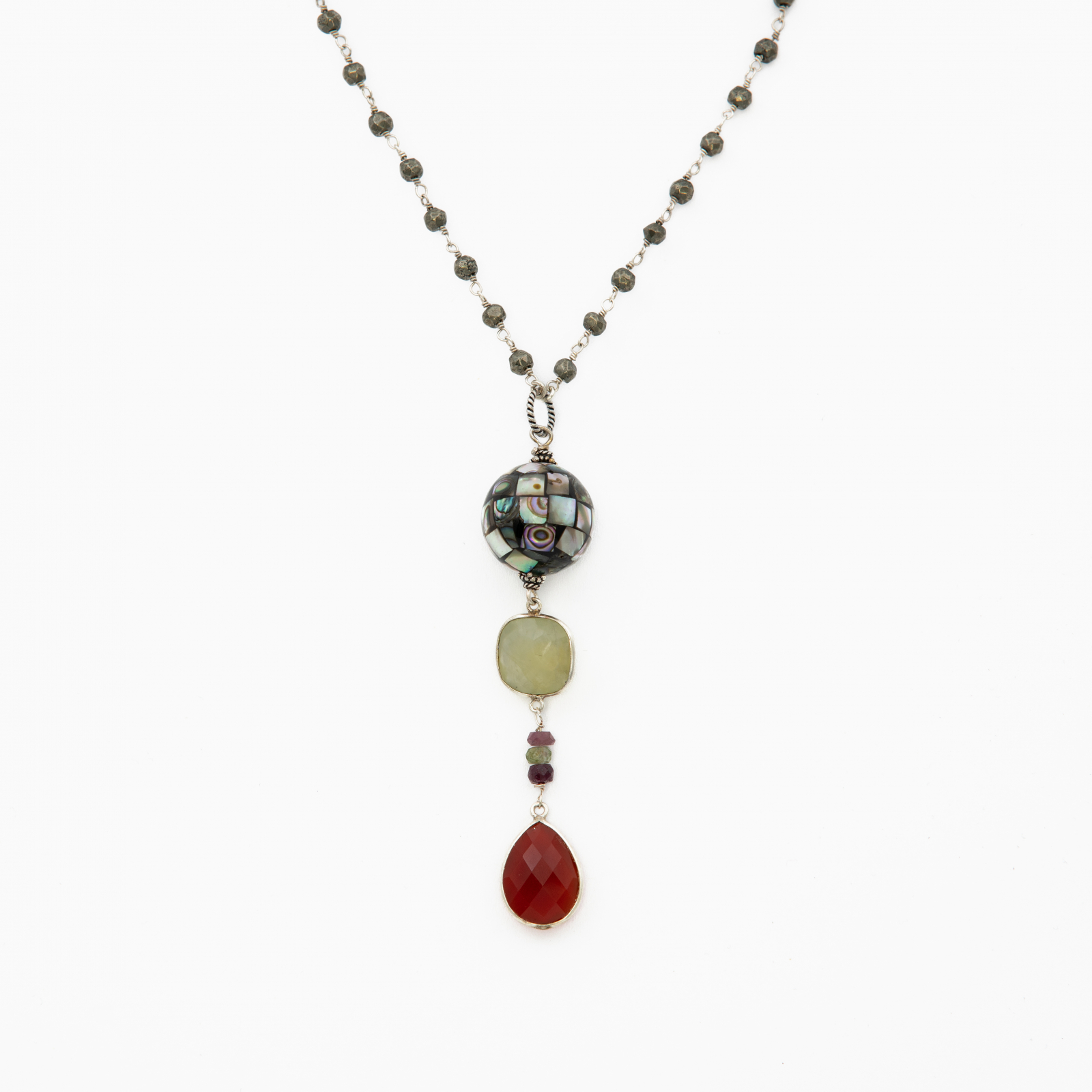 Coletul dv. va cuprinde pe langa produsul Colier argint pietre semipretioase microfatetate pirita 4 mm, pandantul din carneol, prehnit, turmalina multicolora, bila de 18 mm din sidef lungime 59 cm urmatoarele: